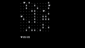x,y=0,0function c(a,b)e={p}if r[a]~=nil and r[a][b]~=nil then l=r[a][b]else t={}for i=-1,11 do t[i]={}for j=-1,11 do u=flr(rnd(20)) t[i][j]=u<5and"#"or"."if u==6then e[#e+1]={x=i,y=j,d="♥"}end end end if r[a]==nil then r[a]={}end r[a][b]=t l=t end p.x%=11p.y%=11 x,y=a,b p.m+=1end p={x=5,y=5,d="@",h=20,m=19}e={p}r={}c(0,0)function _update()p.x+=(btnp(➡️)and(l[p.x+1][p.y]=="."and 1or 0)or 0)-(btnp(⬅️)and(l[p.x-1][p.y]=="."and 1or 0)or 0)p.y+=(btnp(⬇️)and(l[p.x][p.y+1]=="."and 1or 0)or 0)-(btnp(⬆️)and(l[p.x][p.y-1]=="."and 1or 0)or 0)if p.x<0then c(x-1,y)end if p.x>10then c(x+1,y)end if p.y<0then c(x,y-1)end if p.y>10then c(x,y+1)end if btnp(⬆️) or btnp(⬇️) or btnp(⬅️) or btnp(➡️) then p.h-=1end if p.h<0 then del(e,p)end for _,v in pairs(e) do if v.d=="♥"and v.x==p.x and v.y==p.y then del(e,v)p.h+=5p.h=min(p.m,p.h)end end end function _draw()cls(0)for i=0,10 do for j=0,10 do for _,v in pairs(e) do print((v.x==i and v.y==j)and v.d or l[i][j],i*8,j*8)end end end print("♥"..p.h.."/"..p.m,0,100)end